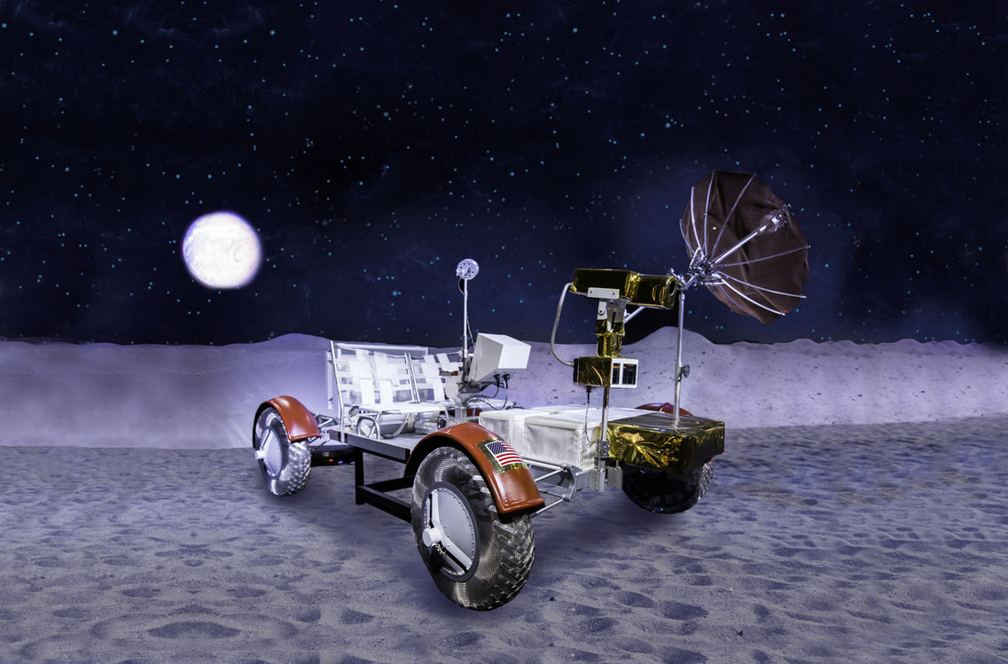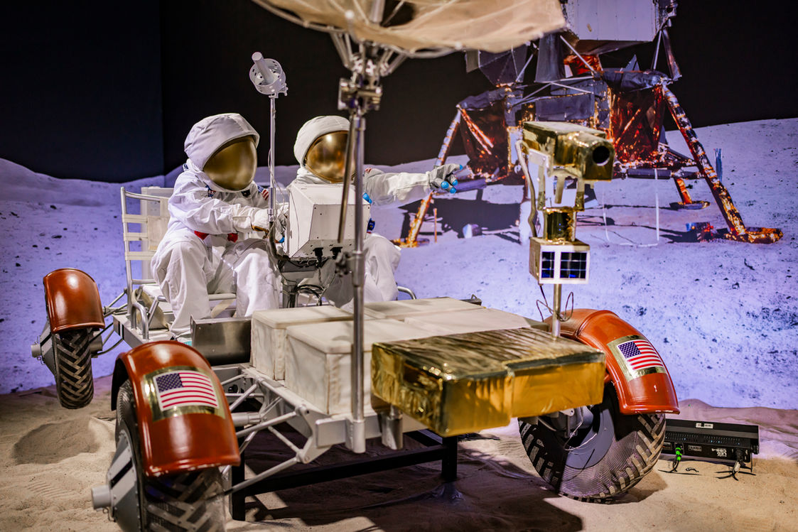 Originální americké a sovětské skafandry, motory raket, kosmické lodě, prototypy lunárních vozidel.